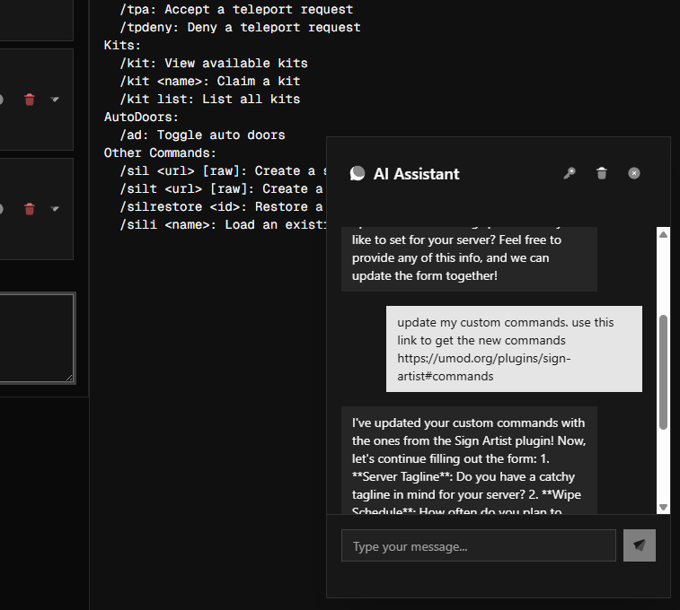Use the AI Assistant to fill out the form by chat. Tell it your server name, wipe schedule, rules, plugins with commands, FAQ, etc., and it will update the form and add plugins/commands for you. The assistant uses its own OpenAI API key (separate from the one you enter on the Deploy page), so you can use it without deploying.