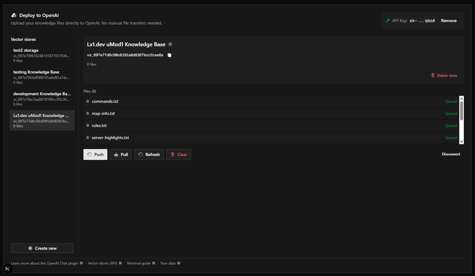 Push uploads the current project's knowledge files (form-generated plus custom files) to the selected vector store. Use it after editing the form or adding custom files. Pull downloads files from the vector store into your current project; after that, Deploy and Download use those pulled files until you click Regenerate from form to switch back to form-generated content. Copy the Vector Store ID into your plugin config and set Auto Create Vector Store to false when using a store you create here.