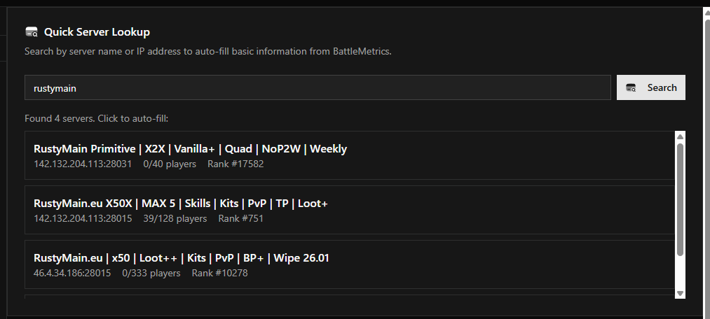 If your server is listed on BattleMetrics, use Quick Server Lookup and enter your server IP and port. The tool will fetch server name, region, players, map size, wipe info, and other details and prefill the form for you.
